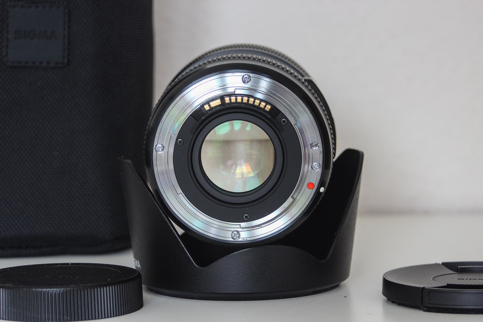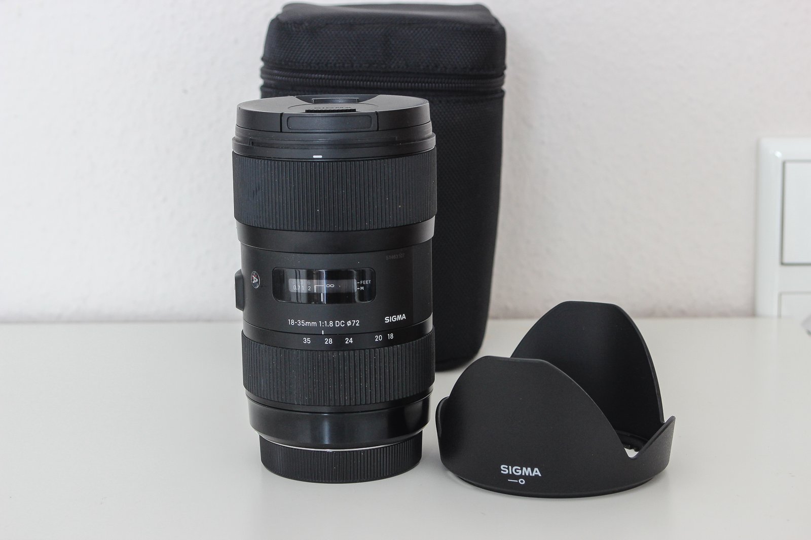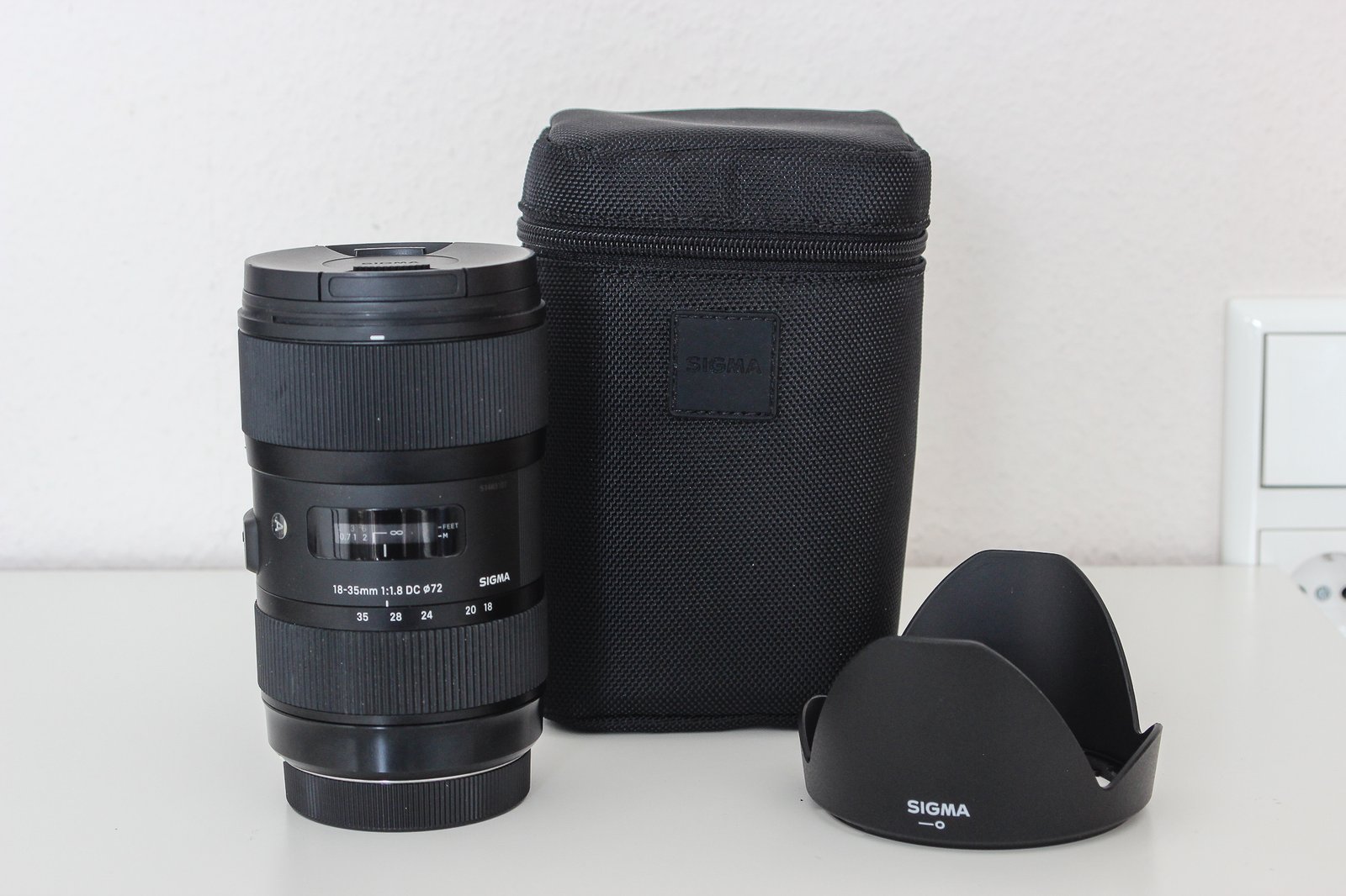Der Lieferumfang besteht aus Objektiv, 2 Deckel, Gegenlichtblende, Tasche.